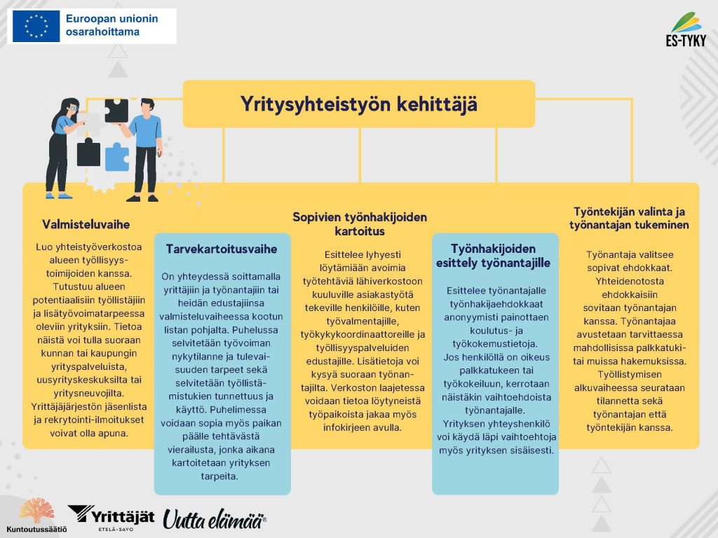 olevien henkilöiden työllistymistä avoimille työmarkkinoille, paikallisiin yrityksiin sekä lisäämme työnantajien työnantajaosaamista ja valmiuksia työllistää erilaisia työntekijöitä.