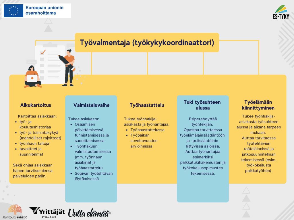 ES-TYKY – Tehdään yhdessä tulevaisuuden työelämää Etelä-Savoon on Euroopan Unionin rahoittama hanke, joka päättyy lokakuussa 2025. Edistämme kestävien työmarkkinoiden rakentumista, vahvistamme haastavassa työmarkkina-asemassa