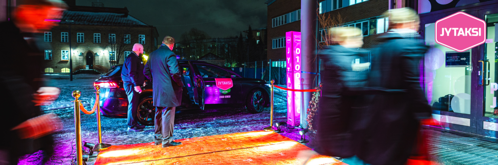 JYTAKSIn kyydissä saavut tyylikkäästi Yrittäjäjuhlaan: juhlapaikan sisäänkäynnillä sinua on vastassa VIP-taksiasemamme, jossa punainen matto ja henkilökuntamme toivottavat sinut lämpimästi tervetulleeksi. Illan päätteeksi varmistamme, että pääset turvallisesti kotimatkalle tai jatkoille taksin kyydissä suoraan VIP-taksiasemaltamme.