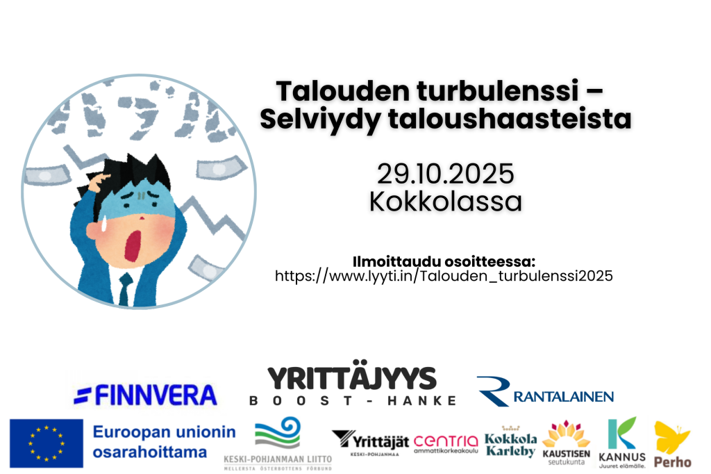 Talouden turbulenssi 29.10.2025 klo. 8.30-11.30 on yrittäjille ja yrityskehityksen parissa työskenteleville suunnattu tilaisuus, jonka järjestämme yhteistyössä Finnveran sekä Rantalaisen kanssa. Täällä sinulla on mahdollisuus sekä kuulla että keskustella yrittäjiä usein kohtaavista talouden haasteista. Tilaisuuden aikana saamme myös kuulla alueellisen yrittäjän oman tarinan siitä, miten hän selvisi talouden haasteista ja mitä ponnisteluja se vaati.