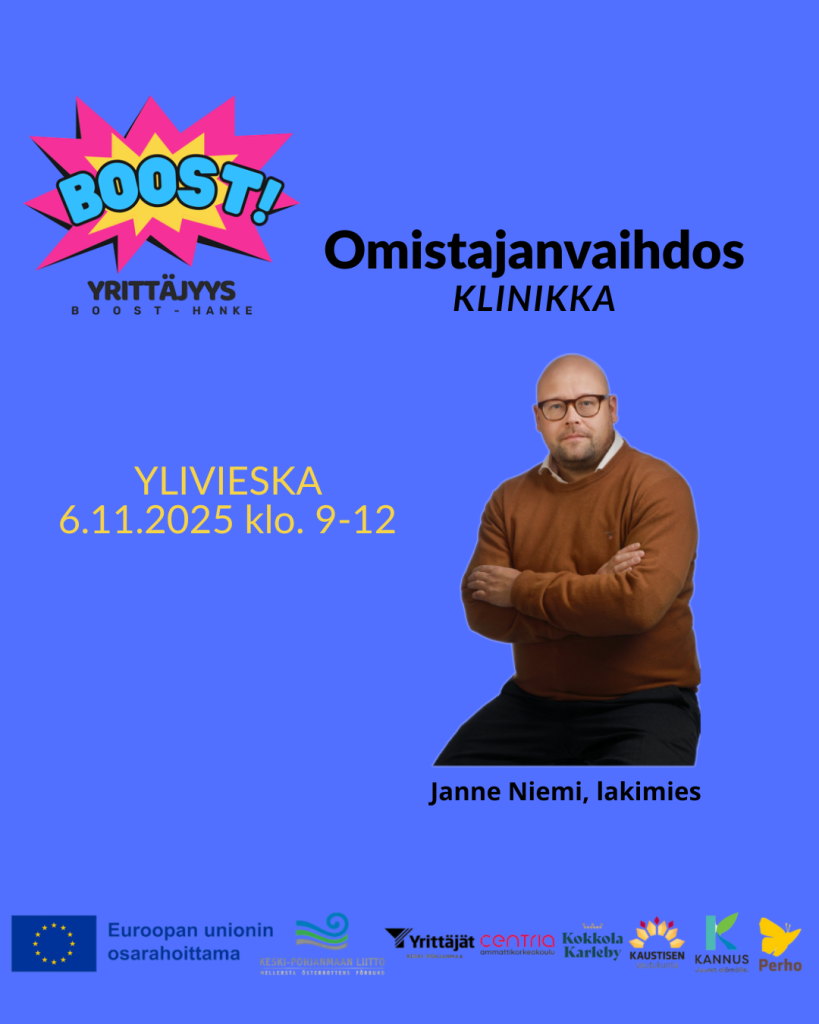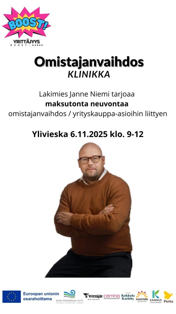 Oletko miettinyt että olisi aika myydä se oma yritys ja löytää jatkaja toiminnalle jota olet pyörittänyt jo vuosia tai ehkä jopa vuosikymmeniä? Siinä tapauksessa tämä valmennus on juuri sinulle! Omistajanvaihdosklinikka 6.11.2025 Ylivieskassa. Varaa aika ja saa 30 minuuttia henkilökohtaista neuvontaa, maksutta! Neuvonta on tarkoitettu sinulle jolla on yrityskaupat mielessä oli kyseessä sitten yrityksen myynti, sukupolven-vaihdos tai oletko kenties ostamassa yritystä. Neuvonnan hoitaa lakimies Janne Niemi.