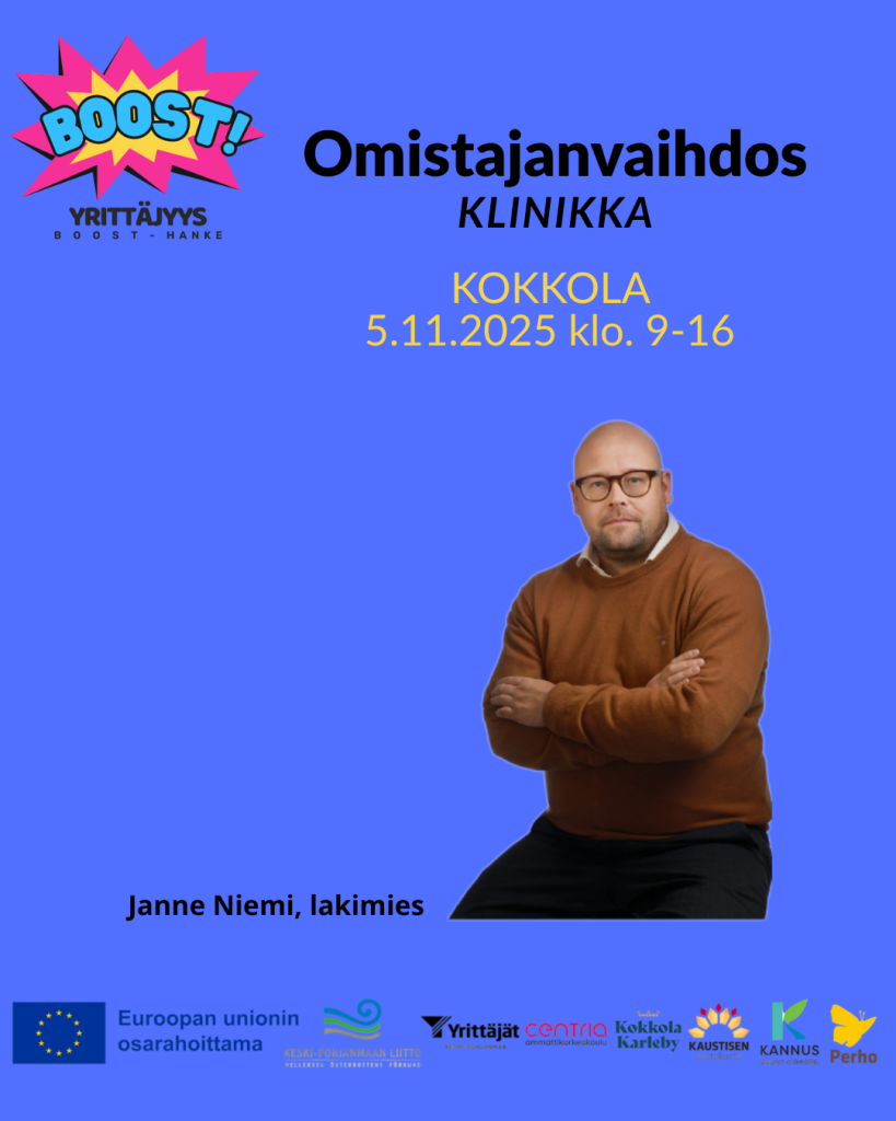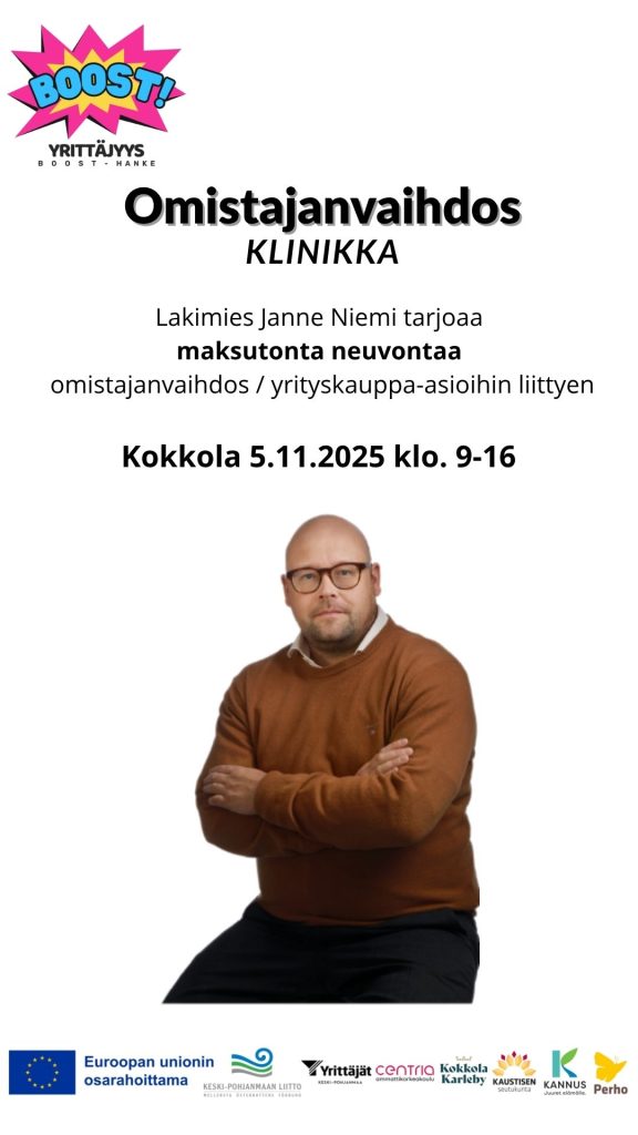 Oletko miettinyt että olisi aika myydä se oma yritys ja löytää jatkaja toiminnalle jota olet pyörittänyt jo vuosia tai ehkä jopa vuosikymmeniä? Siinä tapauksessa tämä valmennus on juuri sinulle! Omistajanvaihdosklinikka 5.11.2025 Kokkolassa. Varaa aika ja saa 30 minuuttia henkilökohtaista neuvontaa, maksutta! Neuvonta on tarkoitettu sinulle jolla on yrityskaupat mielessä oli kyseessä sitten yrityksen myynti, sukupolven-vaihdos tai oletko kenties ostamassa yritystä. Neuvonnan hoitaa lakimies Janne Niemi.