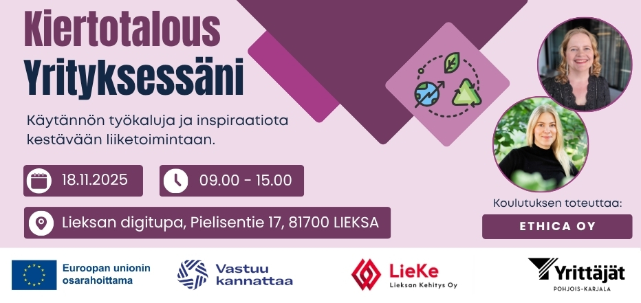 18.11.2025 toteutamme yhteistyöss Lieksan Strategiset Ekosysteemit’ -hankkeen kanssa kiertotalouteen keskittyvän työpajakokonaisuuden Lieksassa. Työpajan kouluttajina toimii Ethica Oy.