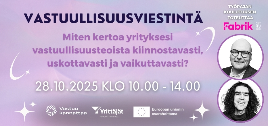 22.5.2025 pidimme Vastuullisuusviestinnän työpajan Joensuussa. Tapahtumasta toteutettiin myös youtube striimi joka on myös jälkikäteen katsottavissa. Tapahtuman koulutuksen toteutti Fabrik.